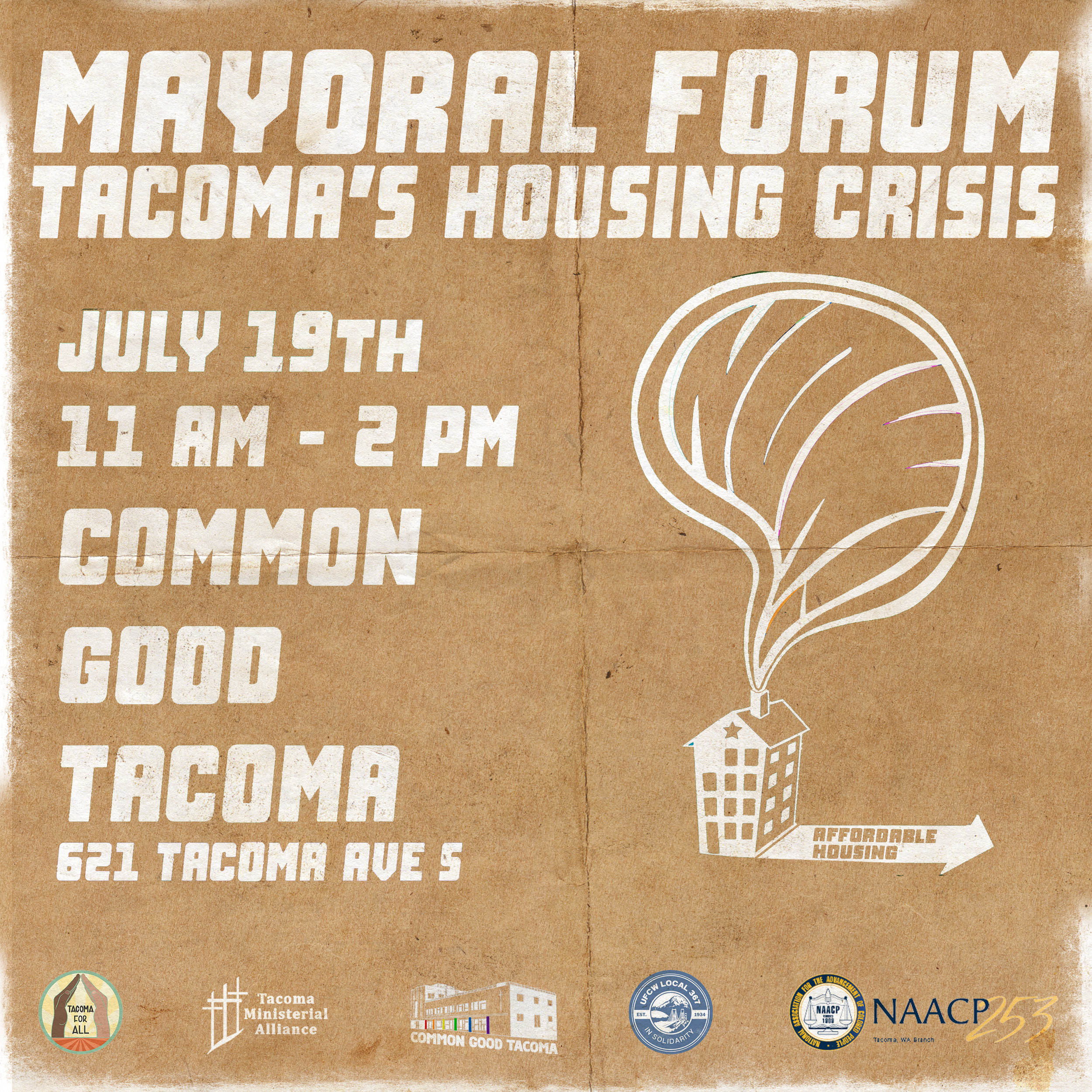 Common Good Tacoma and Tacoma for All, along with UFCW 367, Tacoma Ministerial Alliance, and NAACP have teamed up to host an event on housing justice Saturday, July 19 from 11am-2pm. A highlight of this time will be the forum with mayoral candidates from 12-1:30pm.