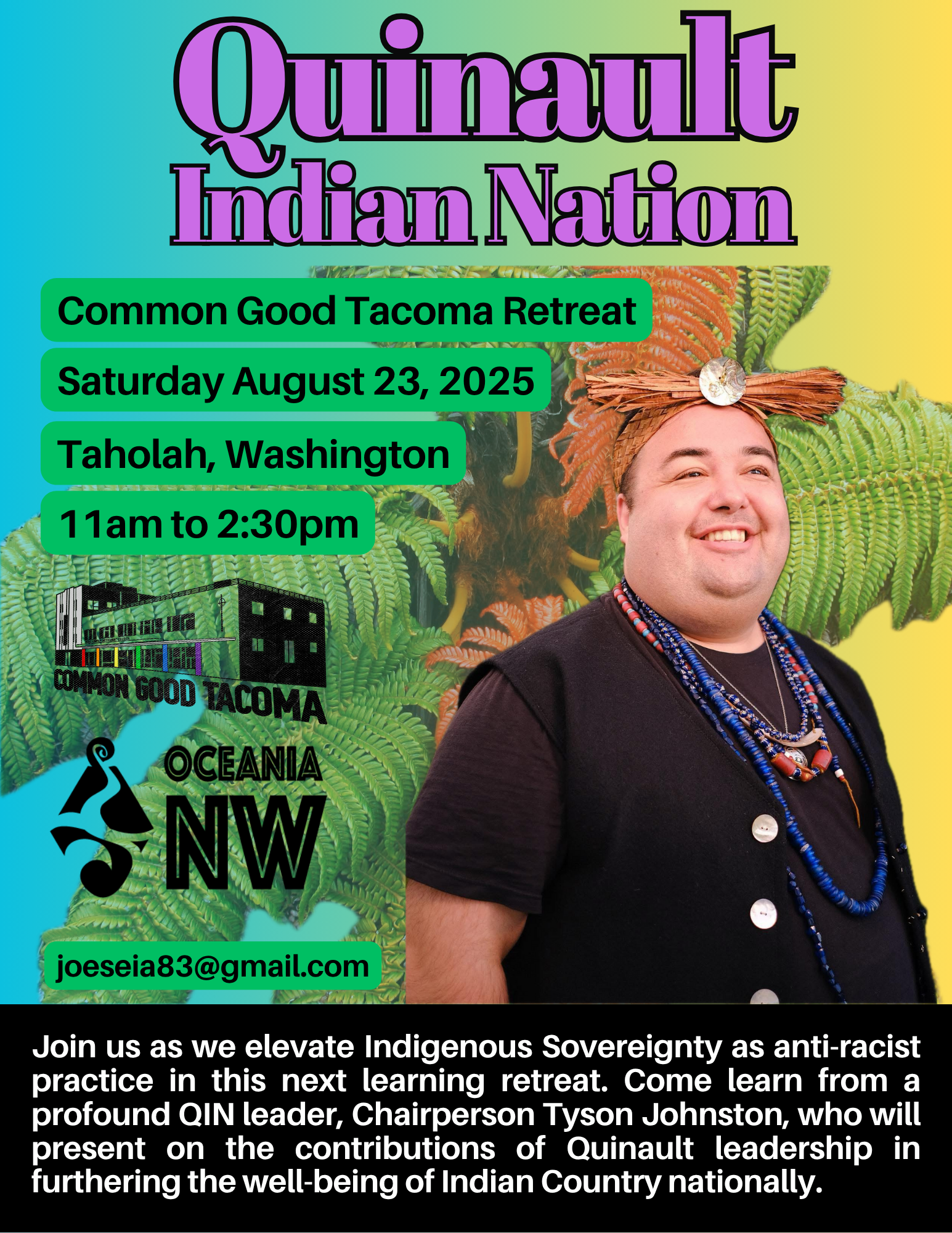 This is an opportunity to build the relational webs that hold us in this justice movement work. We are lovingly invited to Quinault land, which is in alignment with our values of learning from indigenous wisdom. This is a long drive to do in one day so if you would like to reserve a room on Friday night, please email joeseia83@gmail.com. If you do choose to drive up and back, please plan to arrive early as traffic on the coast may be congested.